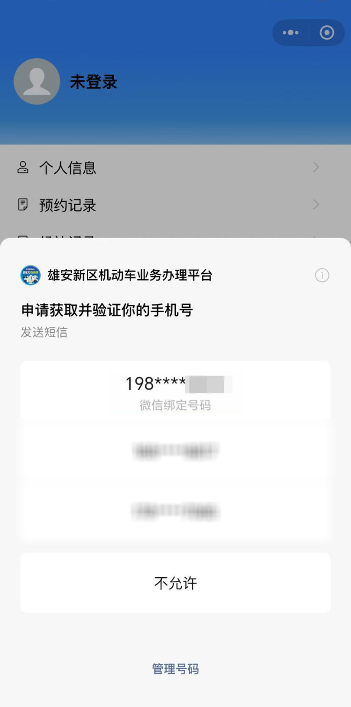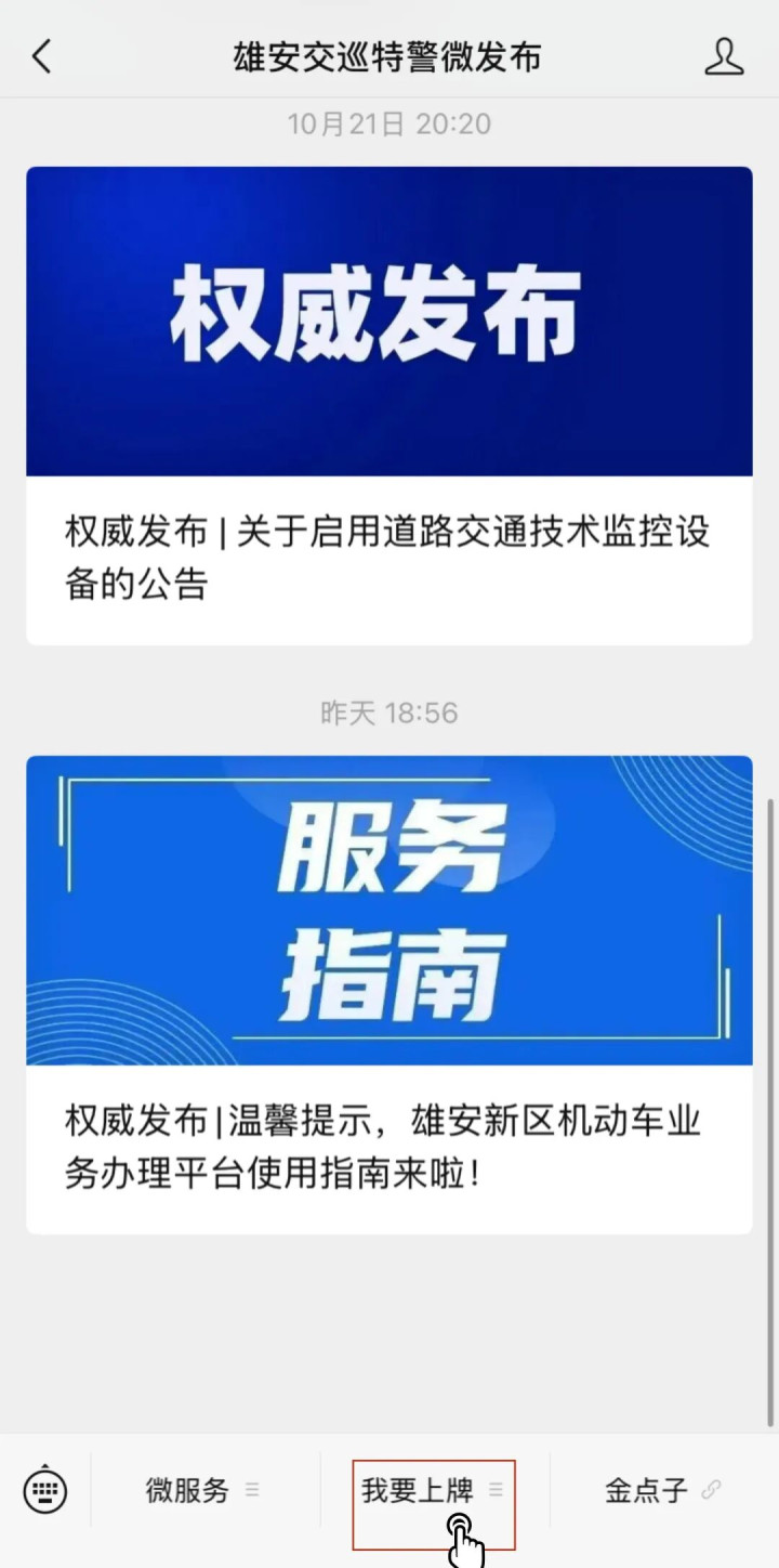 第一步:进入“雄安交巡特警微发布”公众号,点击“我要上牌”进入新版业务办理平台→点击页面下方“我的”,授权获取手机号即可快捷登录。
