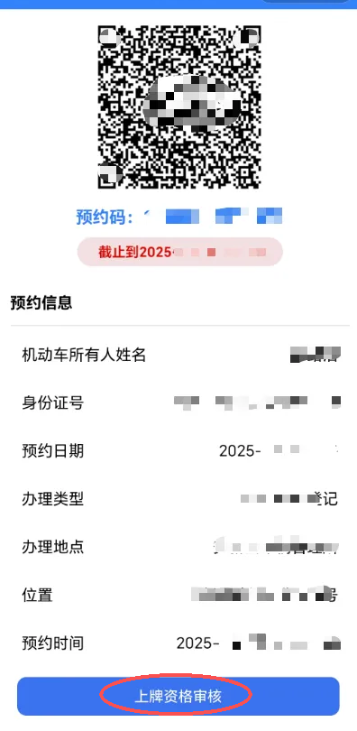第三步:申请人需在预约有效期内前往所选办理地点办理业务,办理时请出示上牌资格证明和预约二维码。