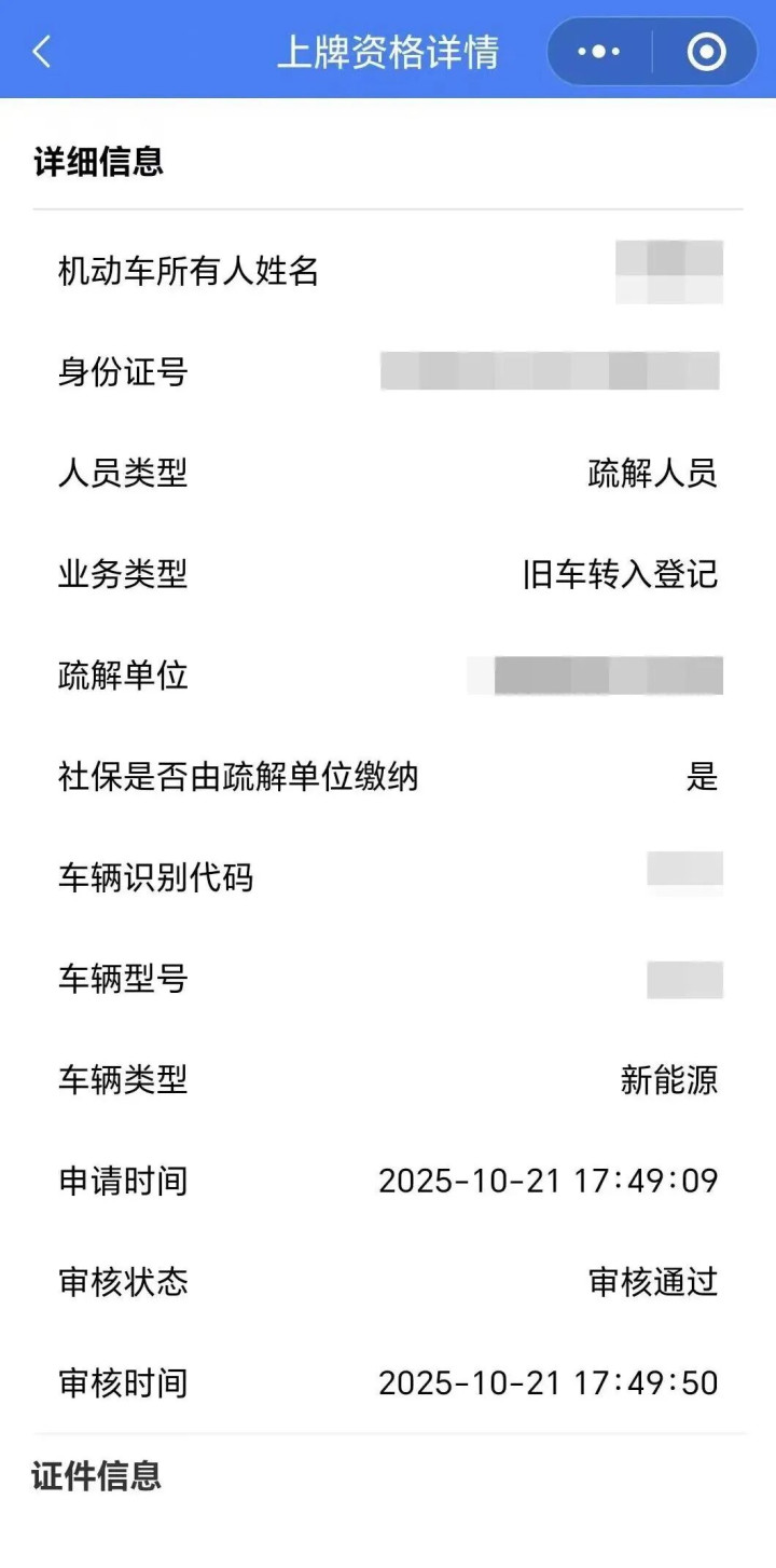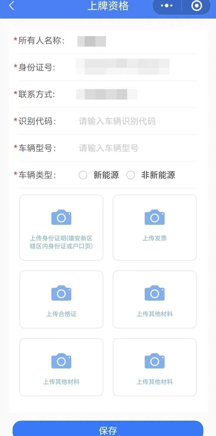第二步:根据选择的人员类型和办理业务类型,填写车辆信息并提交相关证明材料(审核情况可在小程序“我的”点击“上牌资格信息列表”查询,审核通过后可下载打印“上牌资格证明”)。