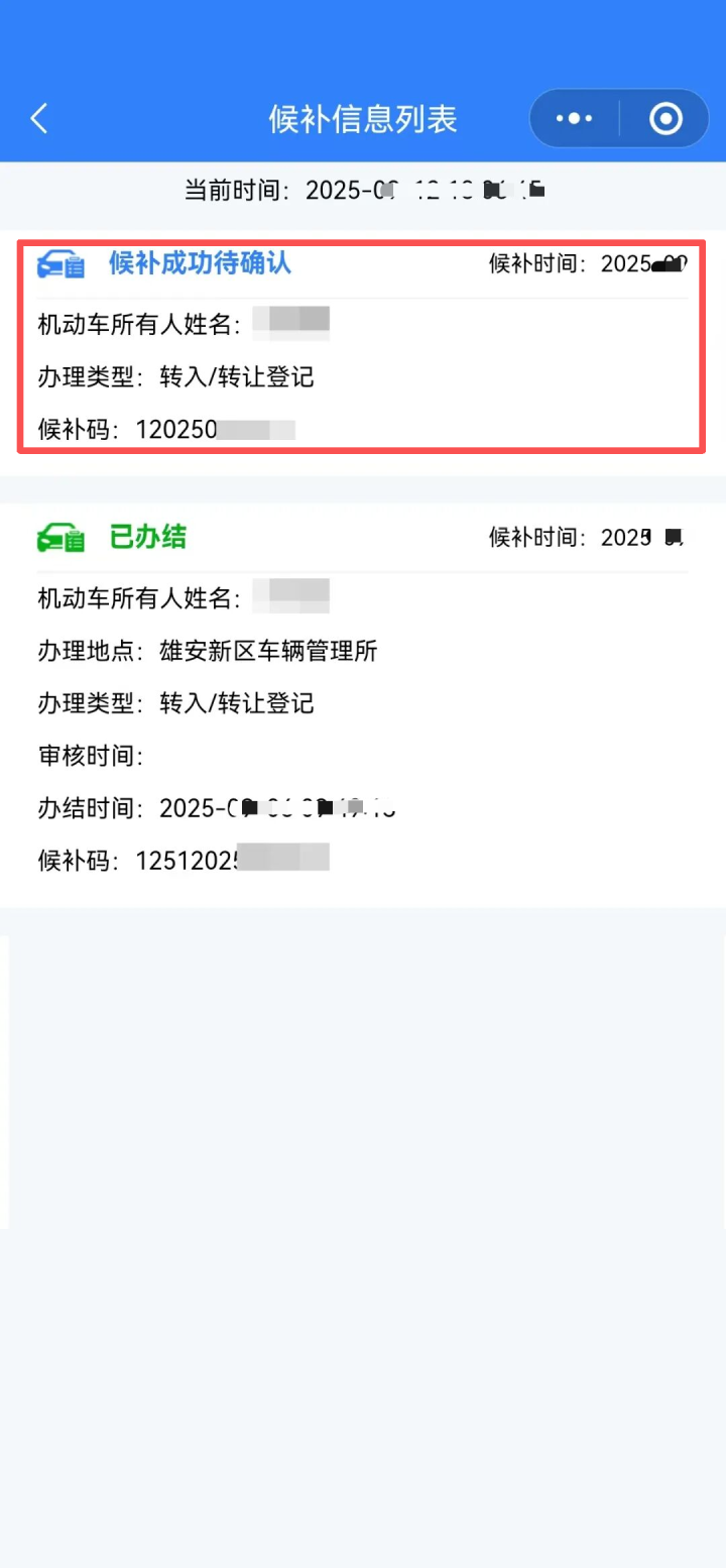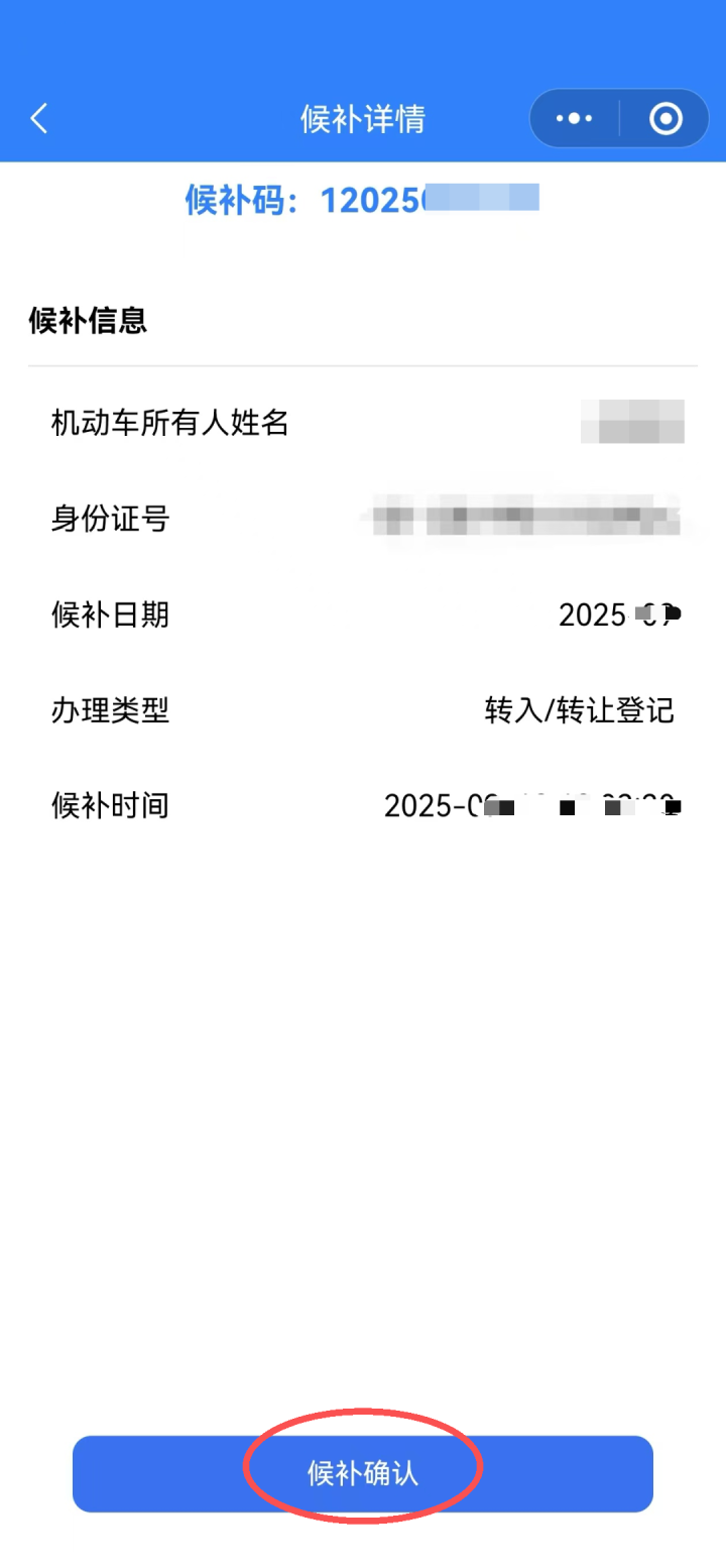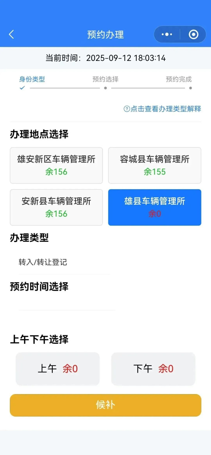 A:当您选择预约的车管所无可用号源时,可点击“候补”并确认。候补成功后,您将收到短信通知。申请人需要在收到通知后的两小时内,进入小程序“我的”→“候补记录”,找到需确认的记录并选择相应车管所。完成候补确认后,即可前往该车管所办理业务。